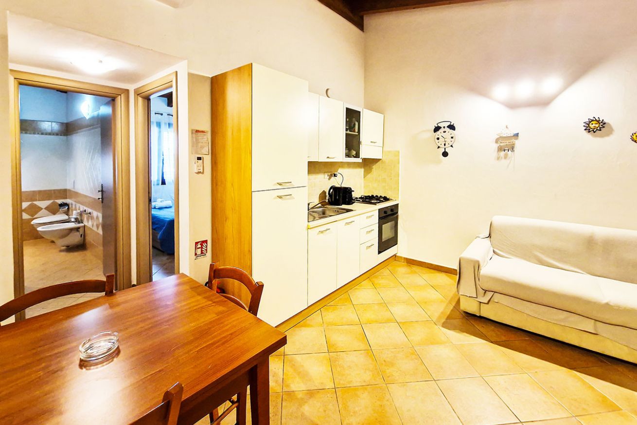 Il bilocale è composto da soggiorno con angolo cottura e divano-letto matrimoniale, camera da letto