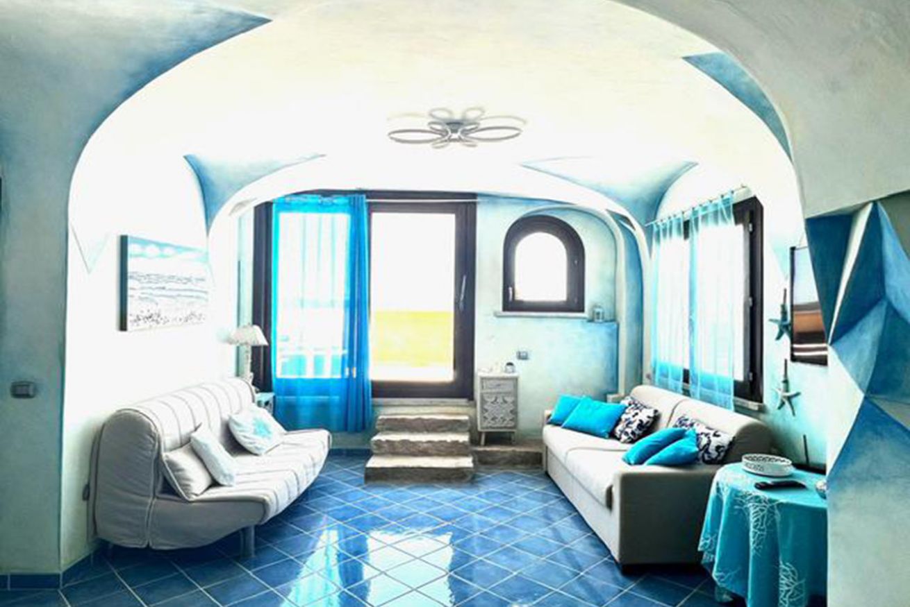 L’appartamento è composto da ampio soggiorno con cucina attrezzata, due camere matrimoniali, un bagno con doccia e ampia terrazza vista mare.