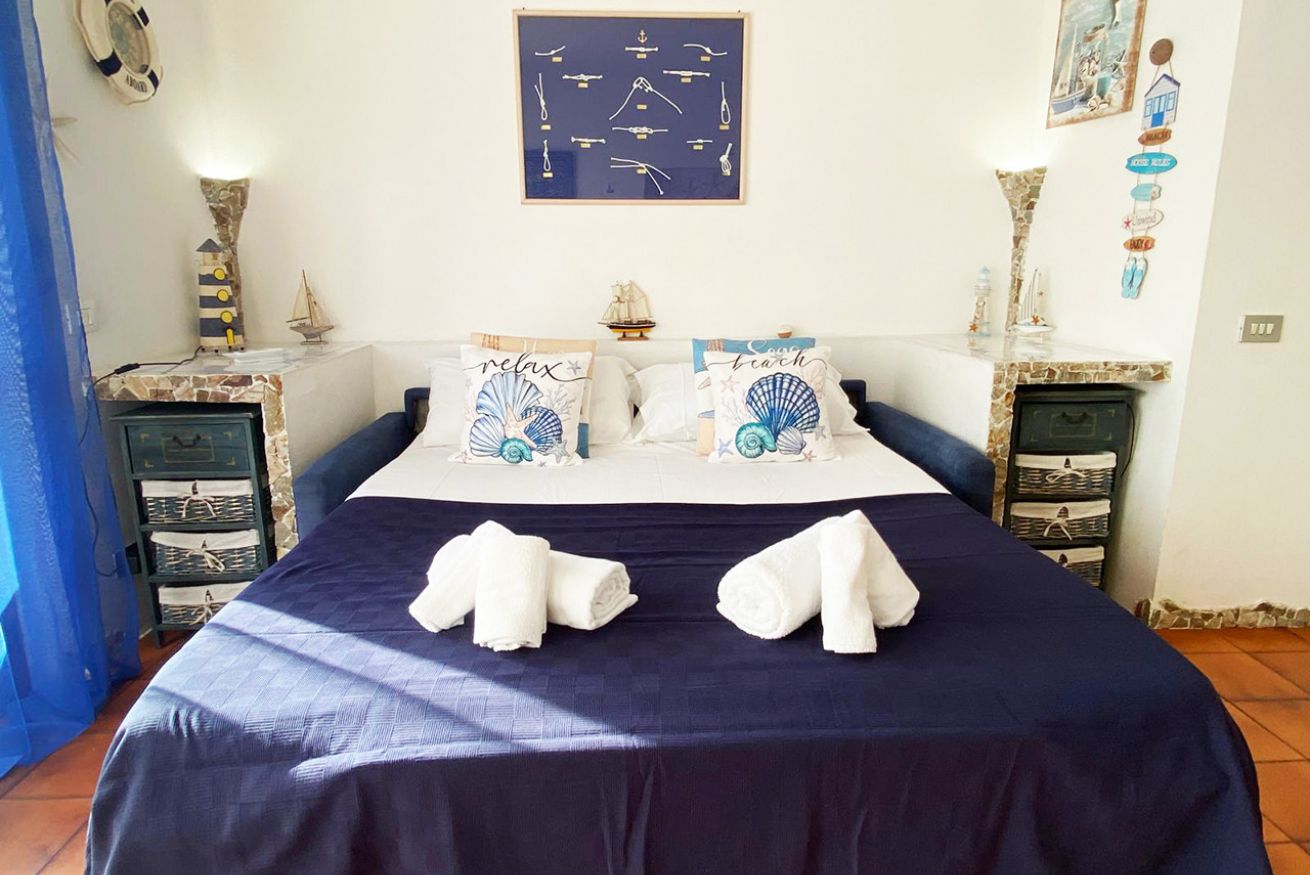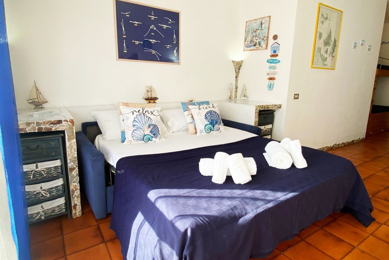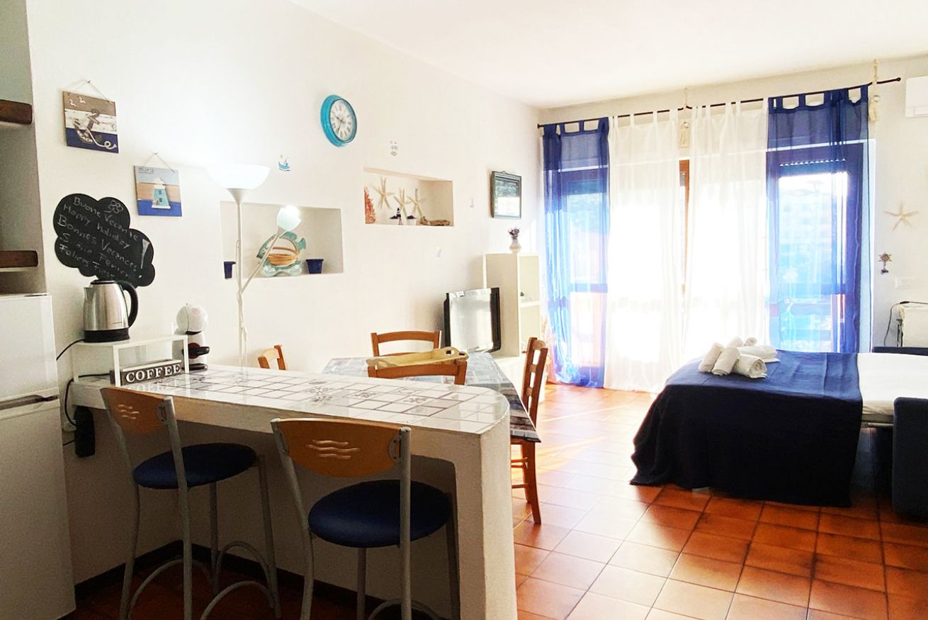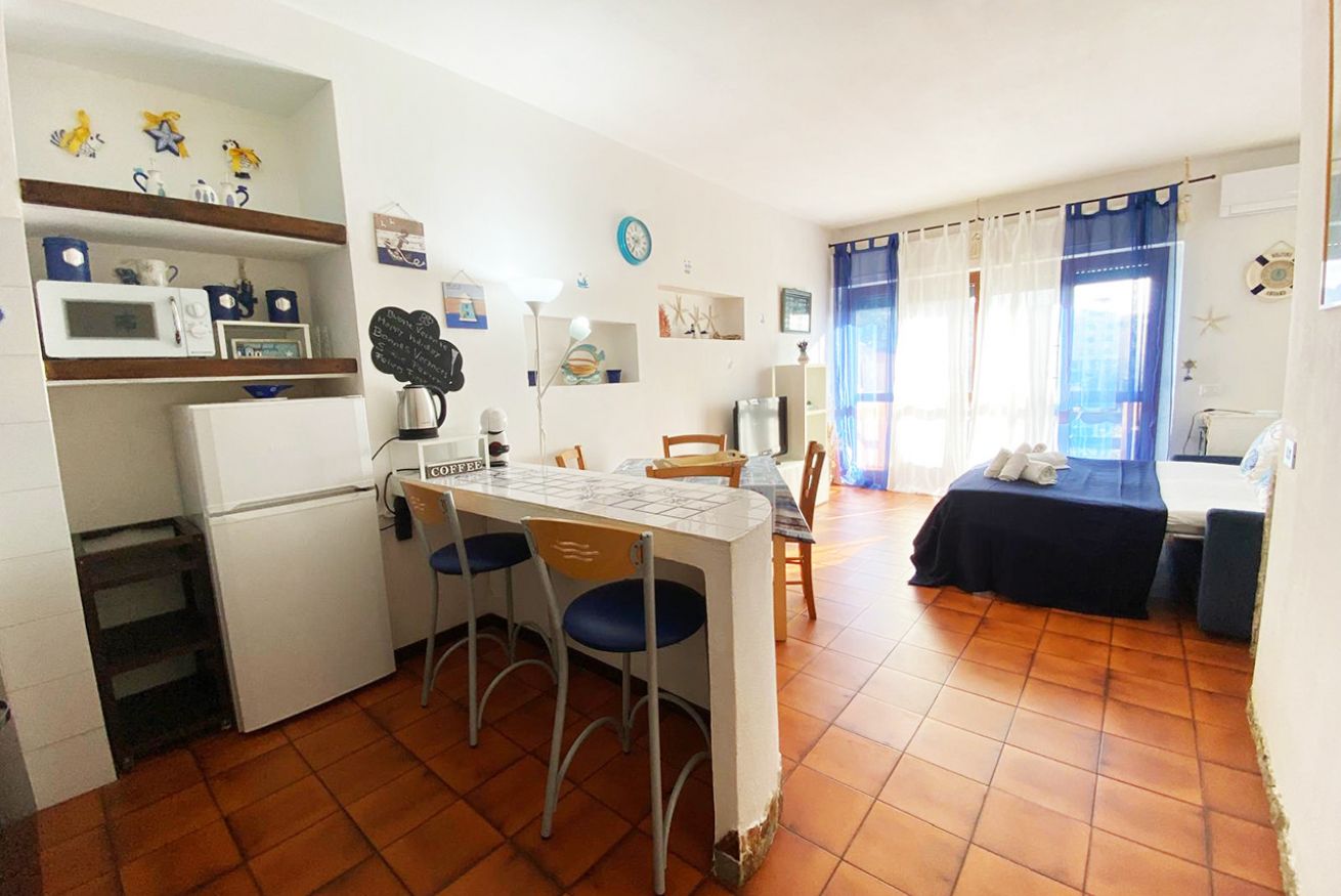 Il monolocale è composto da luminoso soggiorno con angolo cottura, divano letto matrimoniale, bagno con doccia e balcone vista mare con tavolo e sedie.